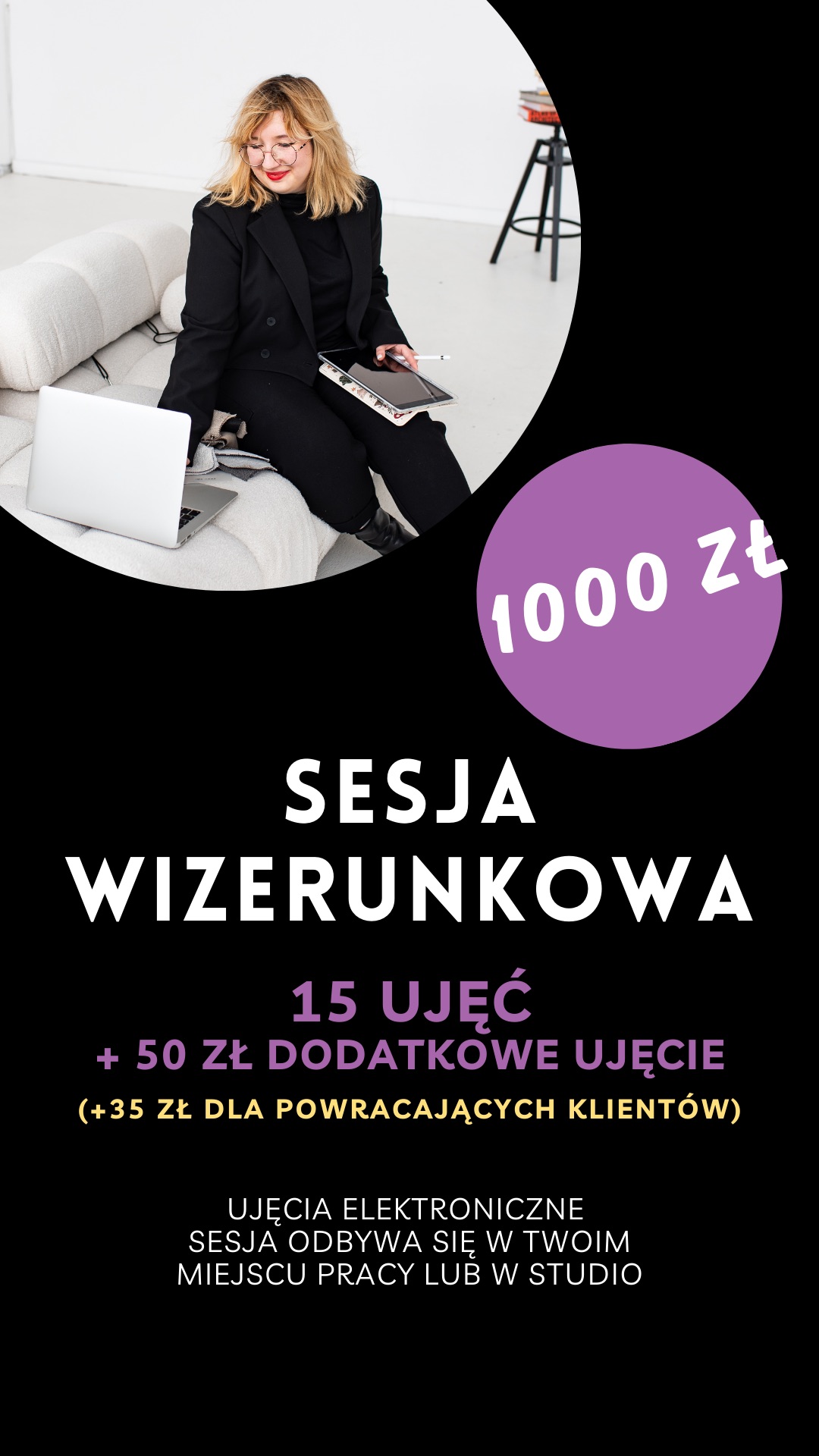 Sesja wizerunkowa odbywa się u Ciebie (w domu, w biurze) lub w studio (dodatkowo płatne 100 zł). Jest ona również sesją lifestyle.